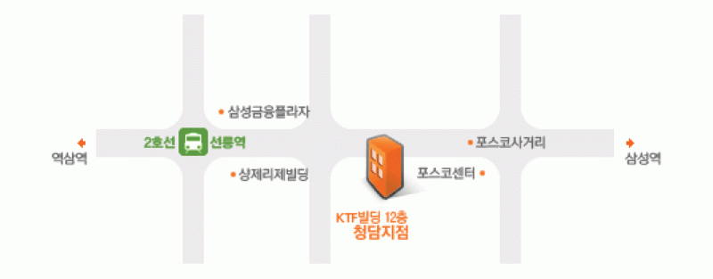 선릉역 사거리와 포스코 사거리 중간에 신호등 있는 건널목 바로 앞에 위치해 있구요, 1층 도로변에 던킨도너츠 매장이 있어서 찾기는 쉬우실 거에요. 선릉역 1번 출구로 나오셔서 진행방향으로 약 5분 거리입니다.